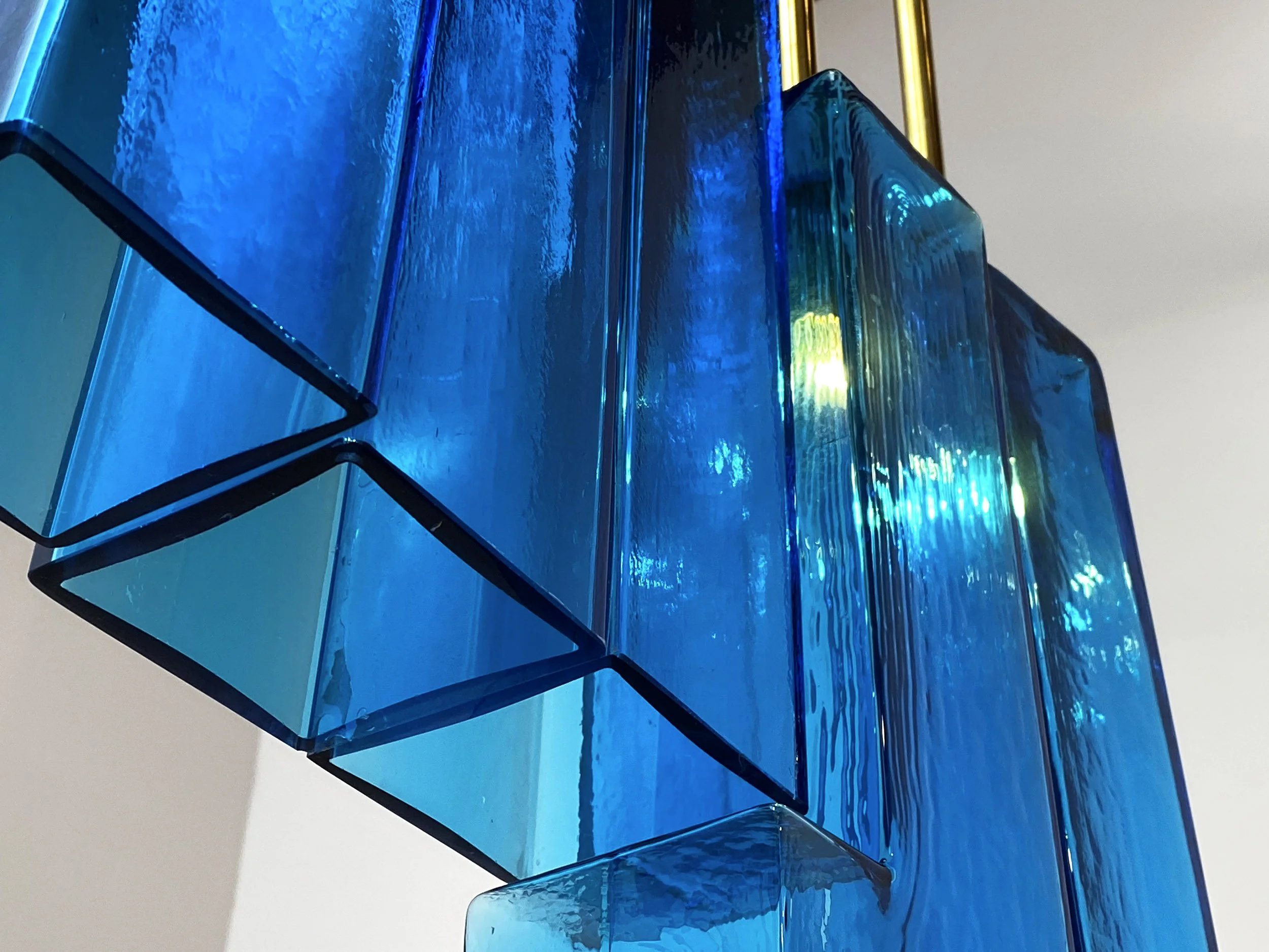 Finalmente, las cautivadoras lámparas encendidas de vidrio azul que fueron suspendidas desde el techo y que poblaron el espacio de la galería en distintos puntos, remiten a las aportaciones de la diseñadora y arquitecta italiana Egle Trincanato (1910-1998). Egle fue la primera mujer en graduarse del Istituto Universitario di Architettura di Venezia en 1938, y su principal tema de investigación fue la propia ciudad italiana, dentro de la cual concibió la inclusión del tejido social en la configuración del espacio urbano, una perspectiva completamente revolucionaria para la época.