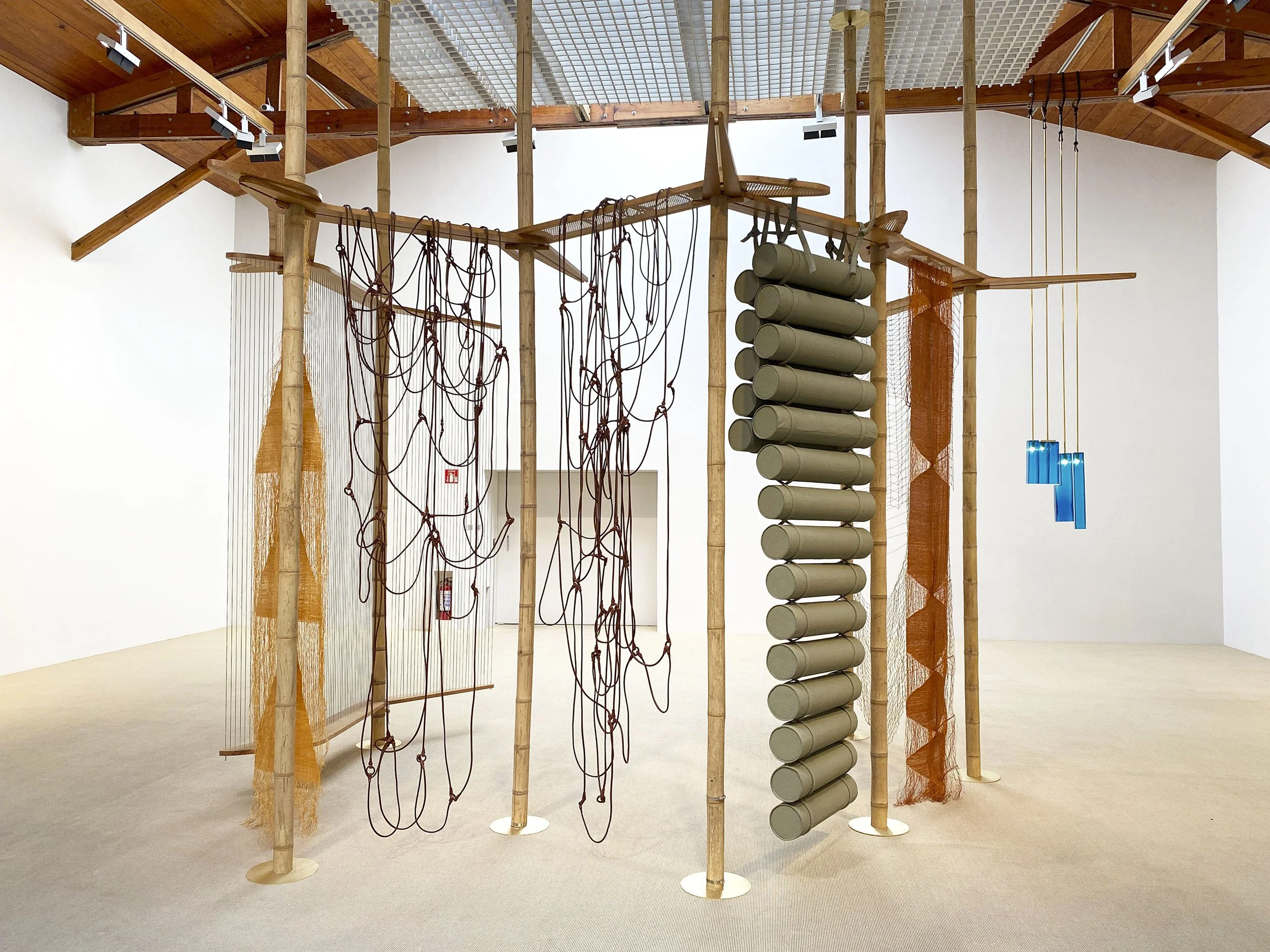 Los arcos de bambú que sostienen la carpa de la Maison de thé nos recuerdan sorprendentemente a las estructuras utilizadas por Leonor para “The Homemaker and Her Domain”. En la Maison de thé, una serie de gigantescas varas de bambú fueron ancladas en el perímetro del terreno, para luego alzarse y curvarse en el centro, sosteniendo la carpa blanca que suavizaba la entrada de luz en el espacio. Por su parte, en la exposición de Leonor en kurimanzutto, los postes de bambú fijados en el piso se alzan en conjunto para sostener una especie de celosía blanca —similar a los difusores de rejilla—, modelando la luz natural que entra por el tragaluz del edificio en el área delimitada por la artista. El uso de los postes de bambú continúan el interés de la artista por hacer uso de dispositivos que se asemejan a los elementos arquitectónicos para integrar el flujo de los visitantes en sus instalaciones, tal y como pudo verse en la exposición de Leonor para la Bienal de Venecia del 2019. En esa ocasión la artista también exploró la idea de instalar estructuras sobre las que sus esculturas pudieran treparse, a la manera de seres parasitarios que necesitan de algún soporte para desarrollarse. En kurimanzutto, el uso de las estructuras de bambú en conjunto con las repisas que parten de la Double chaise longue, conformaron los dispositivos desde los que las esculturas pudieron colgarse y así llevar esta exploración a la idea de lo doméstico. De manera que las distintas piezas tejidas y suspendidas desde las repisas crearon pequeños espacios dentro de la galería, generando una sensación de intimidad y calidez. Incluso las tramas de los tejidos colgados reafirman este sentido de inesperada privacidad doméstica en un espacio público, fungiendo como biombos, cortinas o celosías.
